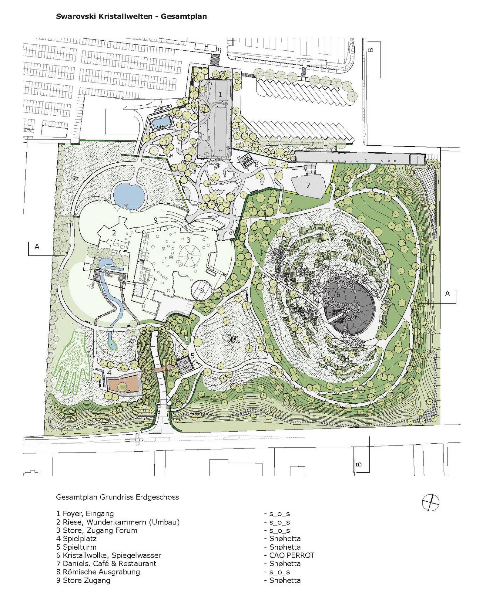 The overall art-concept was supervised by Carla Rumler / Creative Director Swarovski, the park including crystal cloud and mirror pond was designed by the landscape artists Andy Cao and Xavier Perrot / cao perrot studio – Los Angeles & Rennes, restaurant, playtower and store access were designed by the Norwegian architectural office Snøhetta / Kjetil T. Thorsen, Patrick Lüth.