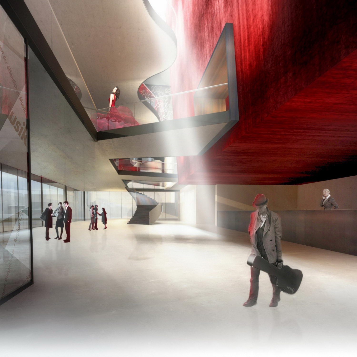 Der Stadtraum fließt nahezu übergangslos in das großzügige Foyer ein. Das Foyer ist nicht nur Kommunikationsbereich, sondern vom Foyer aus werden die Besucher in sämtliche Veranstaltungsbereiche der unterschiedlichen Ebenen, durch visuell prägnant erkennbare Wegführungen geleitet. Somit erstreckt sich der Platz durch das Gebäude bis zu den universitären