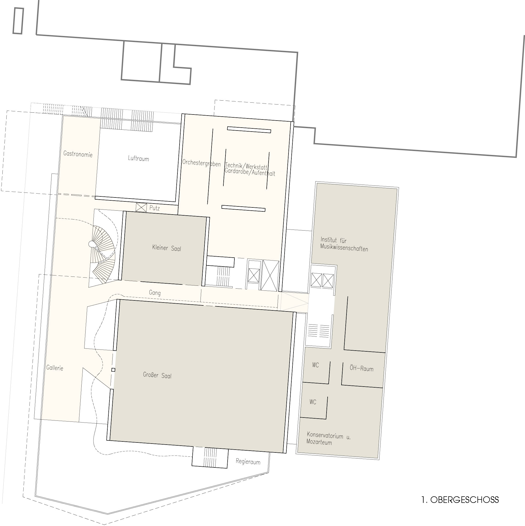 Schon am Eingang der Universität befindet sich zweigeschossig der große Veranstaltungssaal des Konservatoriums und des Mozarteums. So kommuniziert dieser Raum ebenfalls mit dem Stadtraum der Universitätsstraße.