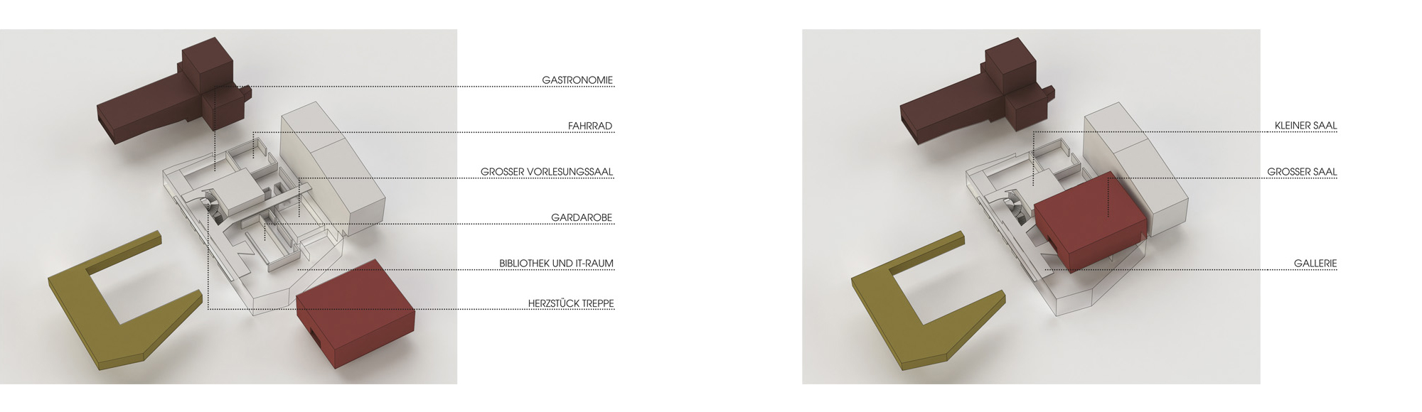 Die verschiedenen Funktionen kommunizieren mit dem Stadtraum und den Besuchern und sind als differenzierte Baumasse in den unterschiedlichen Funktionen sowohl im Innen- als auch im Außenraum signifikant erkennbar.